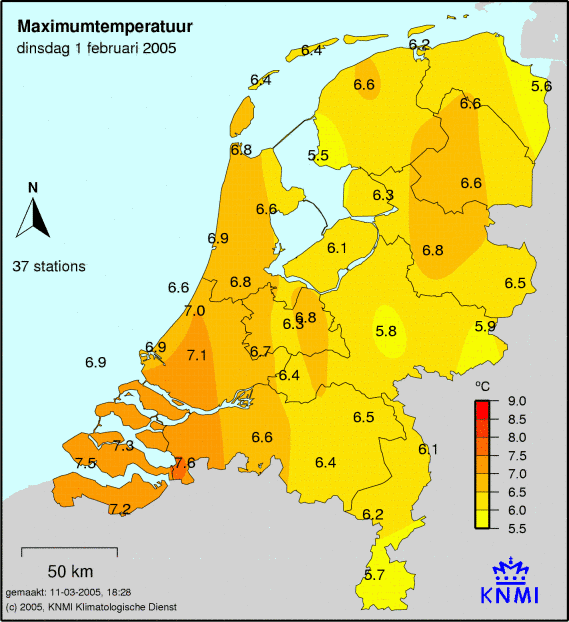 Bekijk het Weer 1 februari 2005. Hoeveel neerslag was het die dag? Wat was de maximum, minimum en gemiddelde temperatuur die dag? Hoe lang scheen de zon en wat was de windkracht? Als er die dag een sneeuwdek lag, dan zie je dit op de laatste afbeelding.