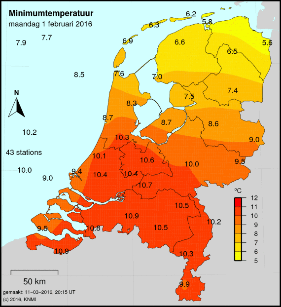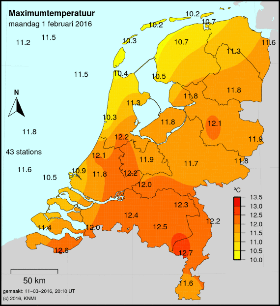 Bekijk het Weer 1 februari 2016. Hoeveel neerslag was het die dag? Wat was de maximum, minimum en gemiddelde temperatuur die dag? Hoe lang scheen de zon en wat was de windkracht? Als er die dag een sneeuwdek lag, dan zie je dit op de laatste afbeelding.