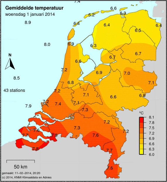 Bekijk het Weer 1 januari 2014. Hoeveel neerslag was het die dag? Wat was de maximum, minimum en gemiddelde temperatuur die dag? Hoe lang scheen de zon en wat was de windkracht? Als er die dag een sneeuwdek lag, dan zie je dit op de laatste afbeelding.