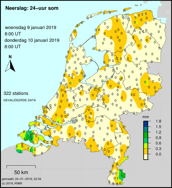 Weer 10 januari 2019 met neerslag, temperatuur, wind en zonuren