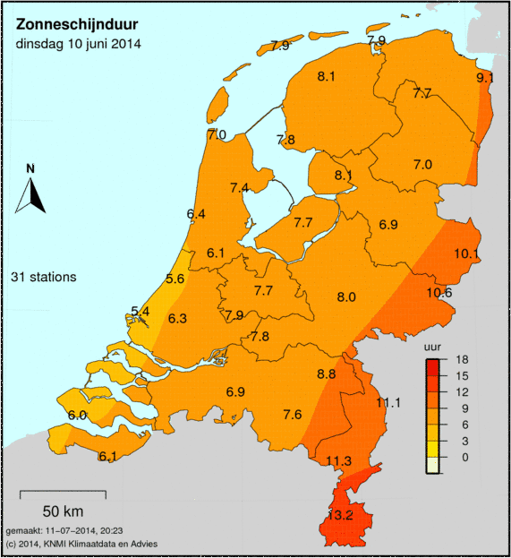 Het aantal zonuren wordt op 33 weerstations gemeten. Hoe donkerder de kleur, hoe meer zonuren er zijn gemeten. Het gemeten aantal zonuren staat op de kaart afgebeeld.