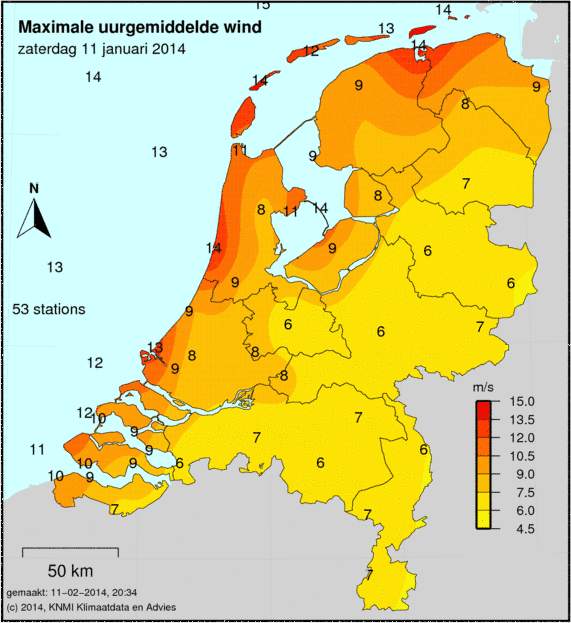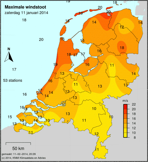Bij windkaarten staat het maximale uurgemiddelde afgebeeld welke deze dag is gemeten. De windkracht wordt op 49 verschillende stations gemeten. Ook wordt de maximale windstoot weergegeven welke is gemeten.
