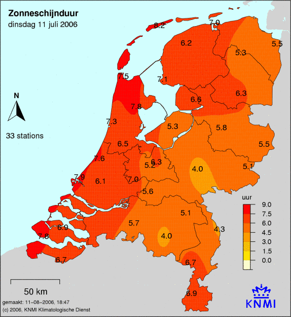 Het aantal zonuren wordt op 33 weerstations gemeten. Hoe donkerder de kleur, hoe meer zonuren er zijn gemeten. Het gemeten aantal zonuren staat op de kaart afgebeeld.