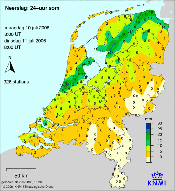 De eerste weerkaart toont de 24-uur som neer slag. De som loopt van 8:-00 tot 8:00, en wordt op 326 weerstations gemeten. Het getal geeft het aantal millimeters aan, hoeveel er deze dag is gevallen.