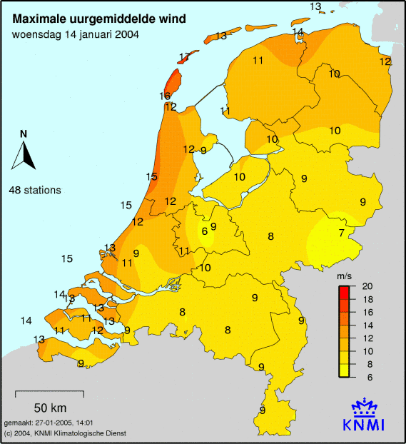 Bij windkaarten staat het maximale uurgemiddelde afgebeeld welke deze dag is gemeten. De windkracht wordt op 49 verschillende stations gemeten. Ook wordt de maximale windstoot weergegeven welke is gemeten.