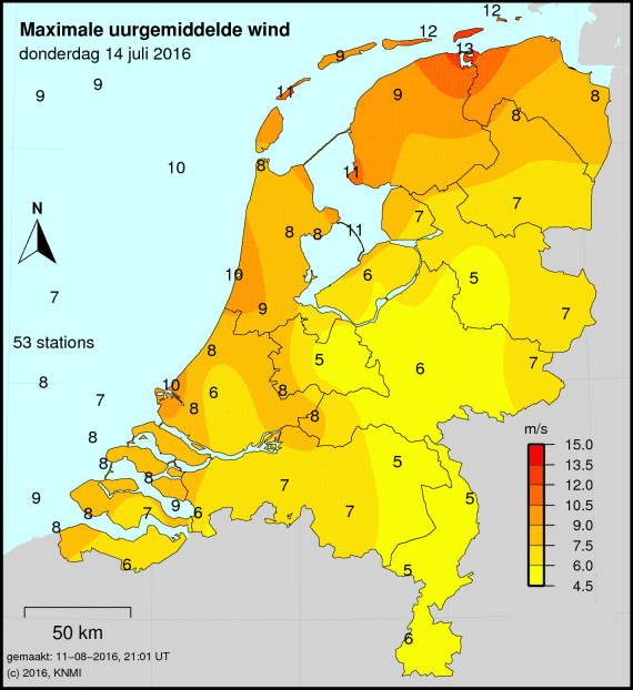 Bij windkaarten staat het maximale uurgemiddelde afgebeeld welke deze dag is gemeten. De windkracht wordt op 49 verschillende stations gemeten. Ook wordt de maximale windstoot weergegeven welke is gemeten.