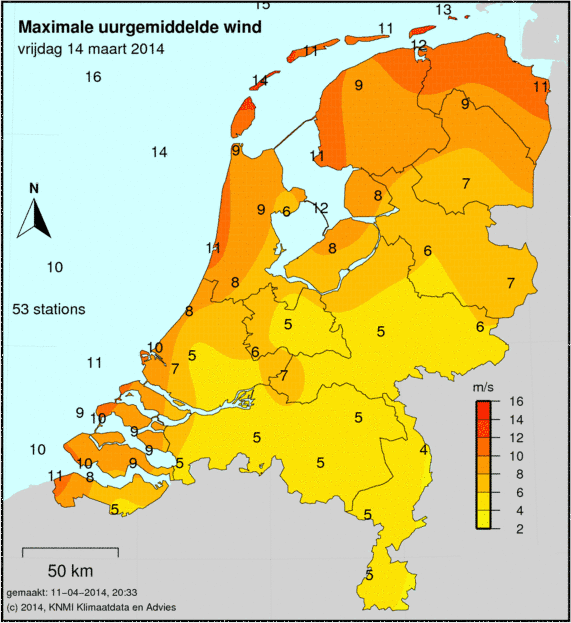 Bij windkaarten staat het maximale uurgemiddelde afgebeeld welke deze dag is gemeten. De windkracht wordt op 49 verschillende stations gemeten. Ook wordt de maximale windstoot weergegeven welke is gemeten.