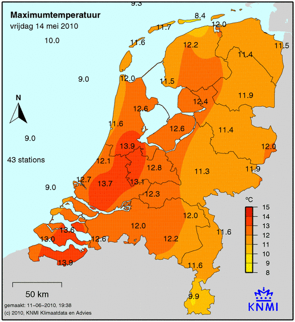 Weer 14 mei 2010 met neerslag, temperatuur, wind en zonuren