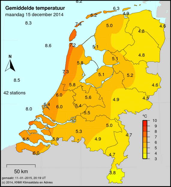 Weer 15 december 2014 met neerslag, temperatuur, wind en zonuren