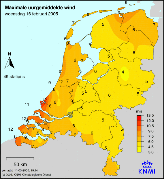Bij windkaarten staat het maximale uurgemiddelde afgebeeld welke deze dag is gemeten. De windkracht wordt op 49 verschillende stations gemeten. Ook wordt de maximale windstoot weergegeven welke is gemeten.
