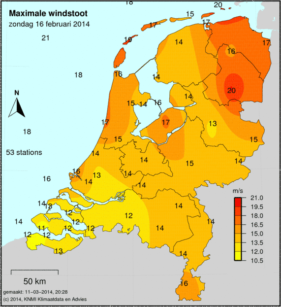 Bij windkaarten staat het maximale uurgemiddelde afgebeeld welke deze dag is gemeten. De windkracht wordt op 49 verschillende stations gemeten. Ook wordt de maximale windstoot weergegeven welke is gemeten.