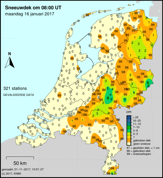 Is er tijdens het Weer 16 januari 2017sneeuw gevallen? Dan zie je dit op de laatste kaart.
