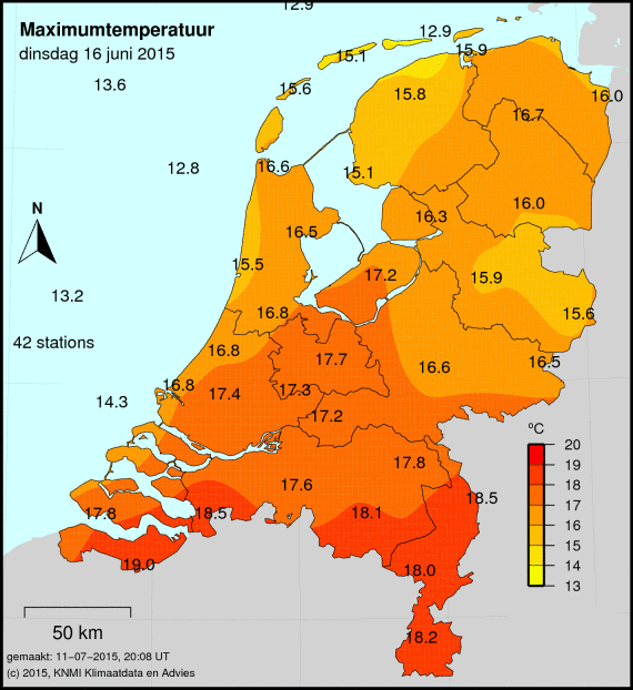 Bekijk het Weer 16 juni 2015. Hoeveel neerslag was het die dag? Wat was de maximum, minimum en gemiddelde temperatuur die dag? Hoe lang scheen de zon en wat was de windkracht? Als er die dag een sneeuwdek lag, dan zie je dit op de laatste afbeelding.