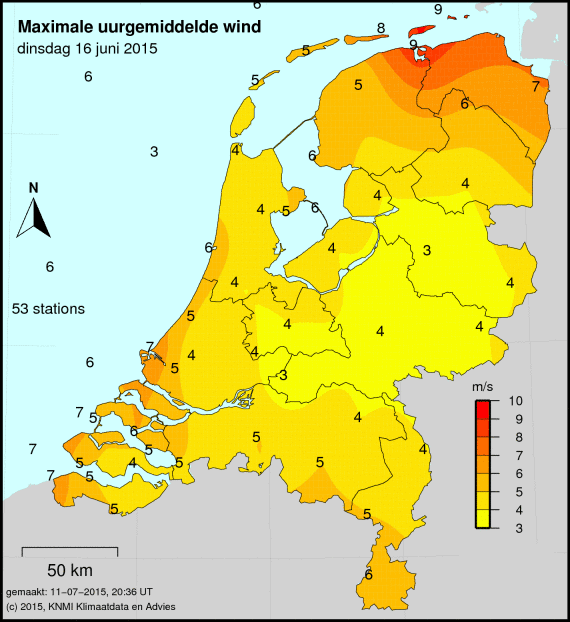 Weer 16 juni 2015 met neerslag, temperatuur, wind en zonuren