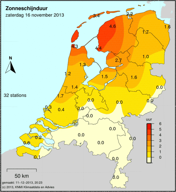 Weer 16 november 2013 met neerslag, temperatuur, wind en zonuren