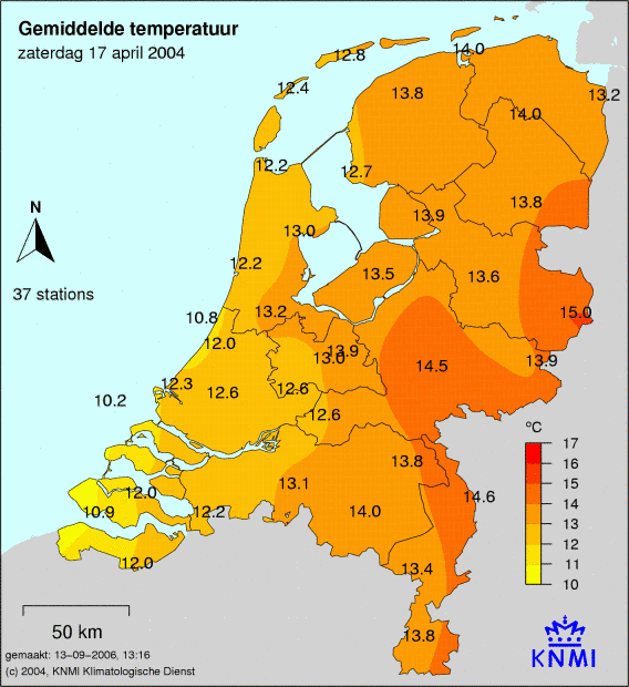 Weer 17 april 2004 met neerslag, temperatuur, wind en zonuren