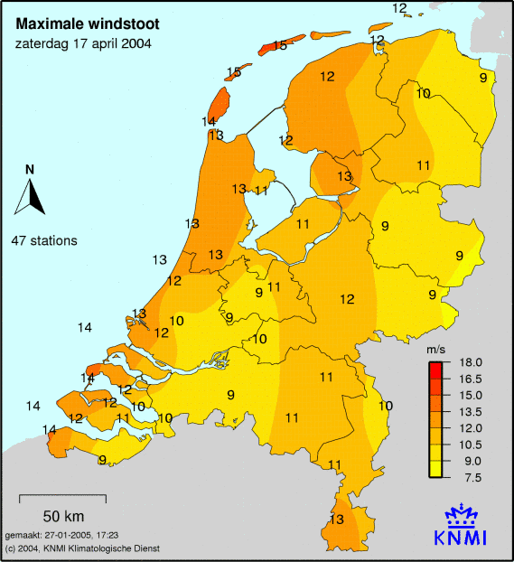 Bij windkaarten staat het maximale uurgemiddelde afgebeeld welke deze dag is gemeten. De windkracht wordt op 49 verschillende stations gemeten. Ook wordt de maximale windstoot weergegeven welke is gemeten.