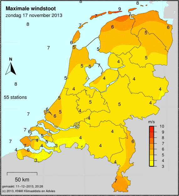 Bij windkaarten staat het maximale uurgemiddelde afgebeeld welke deze dag is gemeten. De windkracht wordt op 49 verschillende stations gemeten. Ook wordt de maximale windstoot weergegeven welke is gemeten.