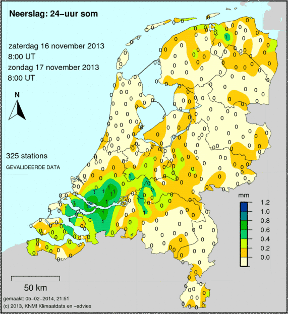 De eerste weerkaart toont de 24-uur som neer slag. De som loopt van 8:-00 tot 8:00, en wordt op 326 weerstations gemeten. Het getal geeft het aantal millimeters aan, hoeveel er deze dag is gevallen.