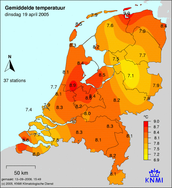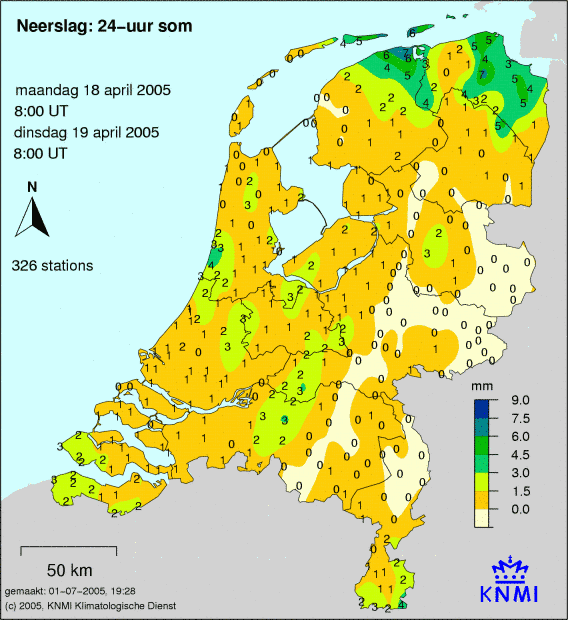 Weer 19 april 2005 met neerslag, temperatuur, wind en zonuren