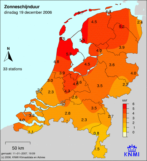 Het aantal zonuren wordt op 33 weerstations gemeten. Hoe donkerder de kleur, hoe meer zonuren er zijn gemeten. Het gemeten aantal zonuren staat op de kaart afgebeeld.