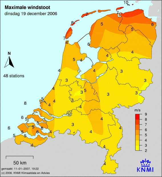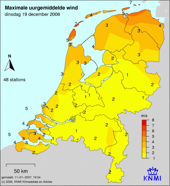 Bij windkaarten staat het maximale uurgemiddelde afgebeeld welke deze dag is gemeten. De windkracht wordt op 49 verschillende stations gemeten. Ook wordt de maximale windstoot weergegeven welke is gemeten.
