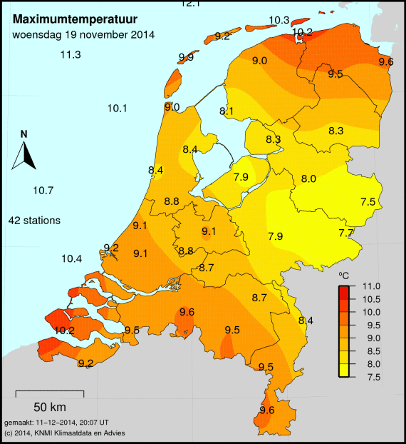 Weer 19 november 2014 met neerslag, temperatuur, wind en zonuren