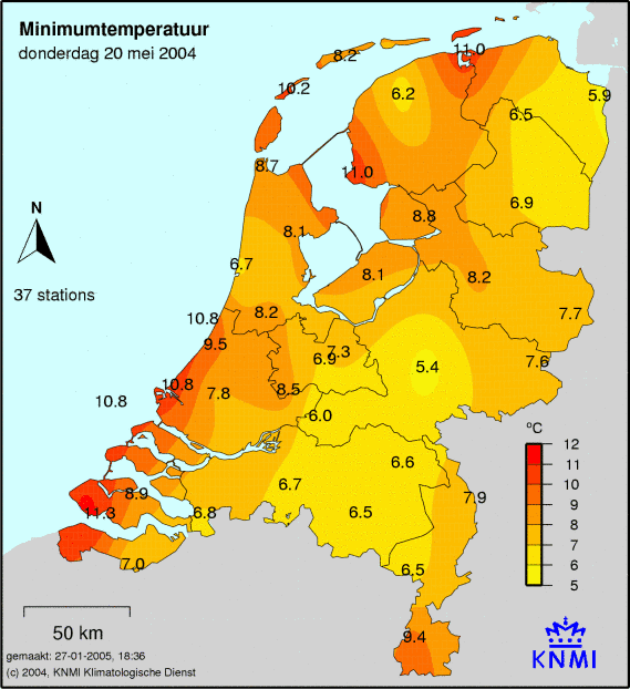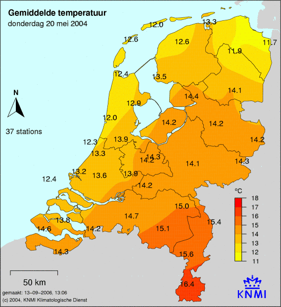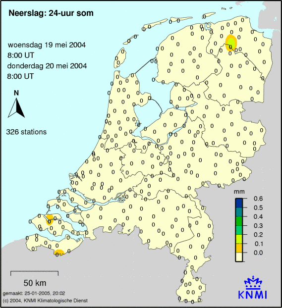 Bekijk het Weer 20 mei 2004. Hoeveel neerslag was het die dag? Wat was de maximum, minimum en gemiddelde temperatuur die dag? Hoe lang scheen de zon en wat was de windkracht? Als er die dag een sneeuwdek lag, dan zie je dit op de laatste afbeelding.