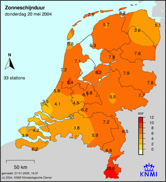 Het aantal zonuren wordt op 33 weerstations gemeten. Hoe donkerder de kleur, hoe meer zonuren er zijn gemeten. Het gemeten aantal zonuren staat op de kaart afgebeeld.