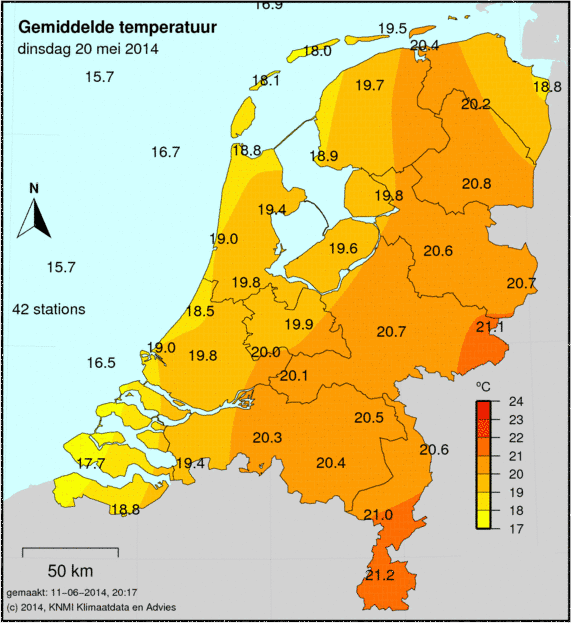 Bekijk het Weer 20 mei 2014. Hoeveel neerslag was het die dag? Wat was de maximum, minimum en gemiddelde temperatuur die dag? Hoe lang scheen de zon en wat was de windkracht? Als er die dag een sneeuwdek lag, dan zie je dit op de laatste afbeelding.