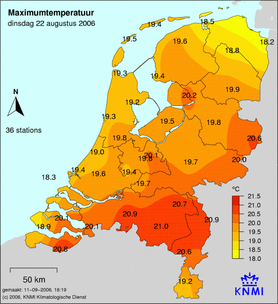 Bij de temperatuur worden drie weerkaarten getoond met de maximum temperatuur, de minimum temperatuur en de gemiddelde temperatuur. Hoe donkerder, hoe warmer. Het aantal graden staat afgebeeld. De temperatuur wordt op 37 weerstations gemeten.