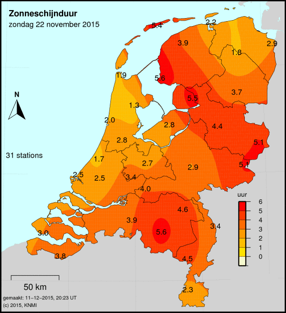 Het aantal zonuren wordt op 33 weerstations gemeten. Hoe donkerder de kleur, hoe meer zonuren er zijn gemeten. Het gemeten aantal zonuren staat op de kaart afgebeeld.