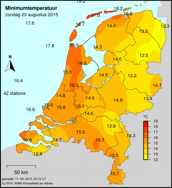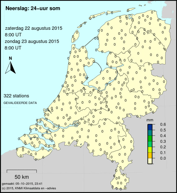 Weer 23 augustus 2015 met neerslag, temperatuur, wind en zonuren