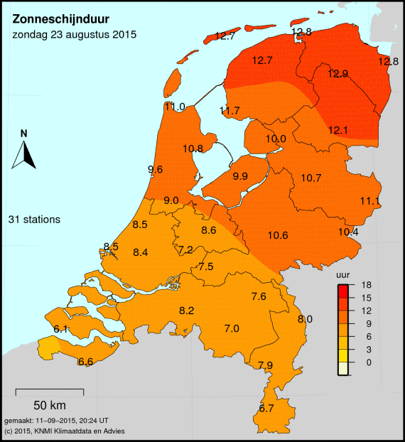Het aantal zonuren wordt op 33 weerstations gemeten. Hoe donkerder de kleur, hoe meer zonuren er zijn gemeten. Het gemeten aantal zonuren staat op de kaart afgebeeld.