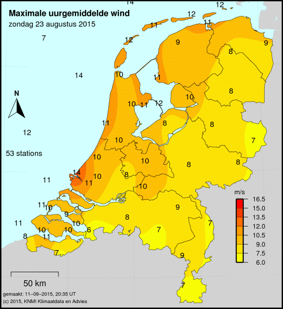 Bij windkaarten staat het maximale uurgemiddelde afgebeeld welke deze dag is gemeten. De windkracht wordt op 49 verschillende stations gemeten. Ook wordt de maximale windstoot weergegeven welke is gemeten.