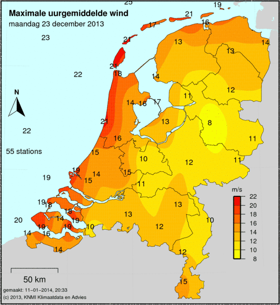 Bij windkaarten staat het maximale uurgemiddelde afgebeeld welke deze dag is gemeten. De windkracht wordt op 49 verschillende stations gemeten. Ook wordt de maximale windstoot weergegeven welke is gemeten.