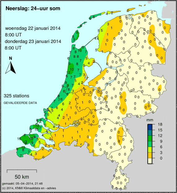 De eerste weerkaart toont de 24-uur som neer slag. De som loopt van 8:-00 tot 8:00, en wordt op 326 weerstations gemeten. Het getal geeft het aantal millimeters aan, hoeveel er deze dag is gevallen.