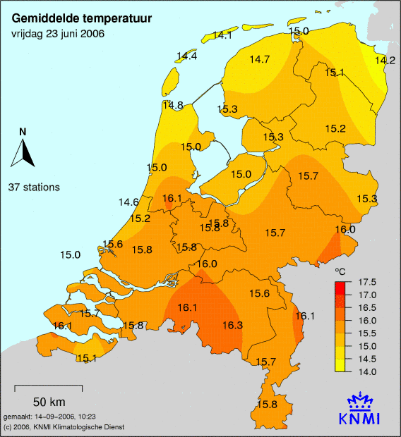 Weer 23 juni 2006 met neerslag, temperatuur, wind en zonuren