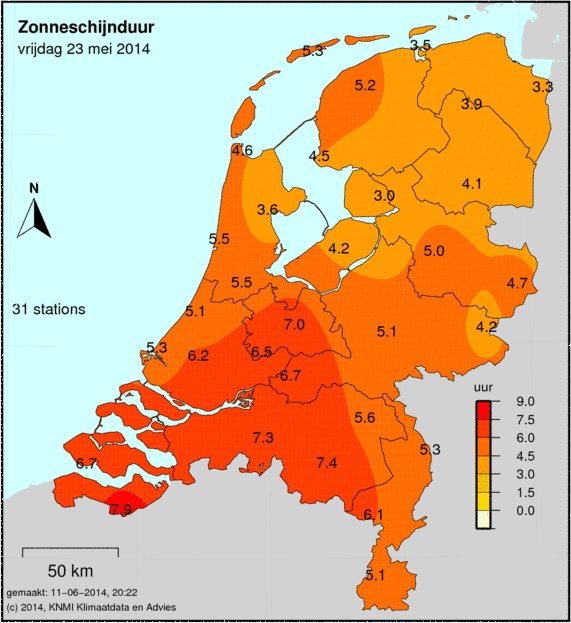 Het aantal zonuren wordt op 33 weerstations gemeten. Hoe donkerder de kleur, hoe meer zonuren er zijn gemeten. Het gemeten aantal zonuren staat op de kaart afgebeeld.