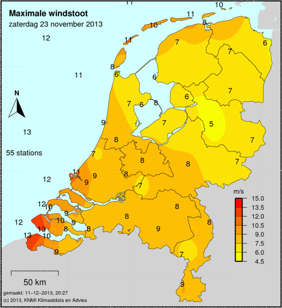 Bij windkaarten staat het maximale uurgemiddelde afgebeeld welke deze dag is gemeten. De windkracht wordt op 49 verschillende stations gemeten. Ook wordt de maximale windstoot weergegeven welke is gemeten.
