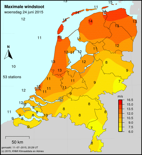 Weer 24 juni 2015 met neerslag, temperatuur, wind en zonuren