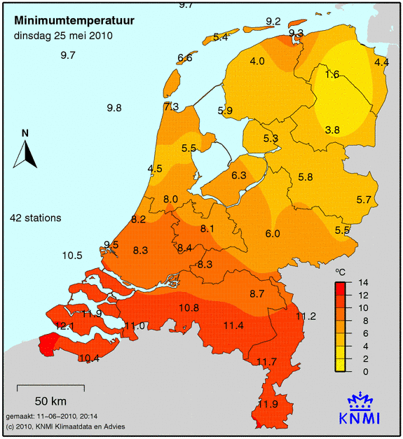 Bekijk het Weer 25 mei 2010. Hoeveel neerslag was het die dag? Wat was de maximum, minimum en gemiddelde temperatuur die dag? Hoe lang scheen de zon en wat was de windkracht? Als er die dag een sneeuwdek lag, dan zie je dit op de laatste afbeelding.