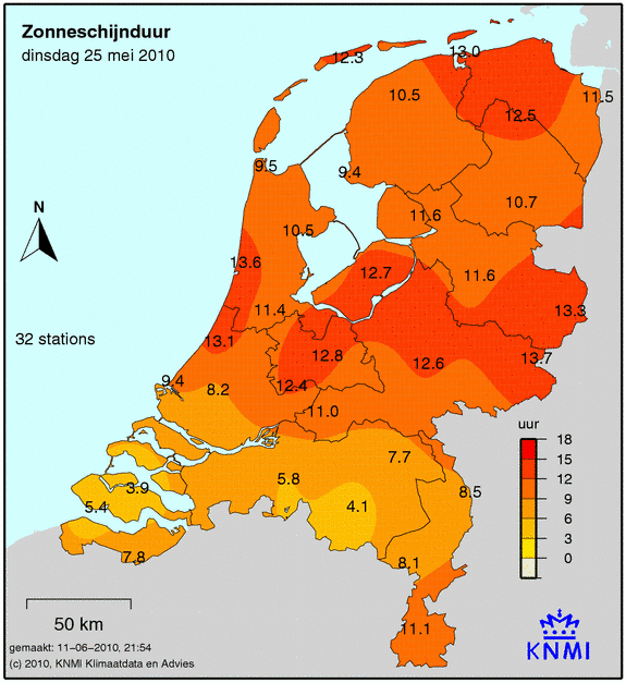Het aantal zonuren wordt op 33 weerstations gemeten. Hoe donkerder de kleur, hoe meer zonuren er zijn gemeten. Het gemeten aantal zonuren staat op de kaart afgebeeld.