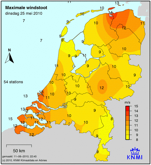 Bij windkaarten staat het maximale uurgemiddelde afgebeeld welke deze dag is gemeten. De windkracht wordt op 49 verschillende stations gemeten. Ook wordt de maximale windstoot weergegeven welke is gemeten.