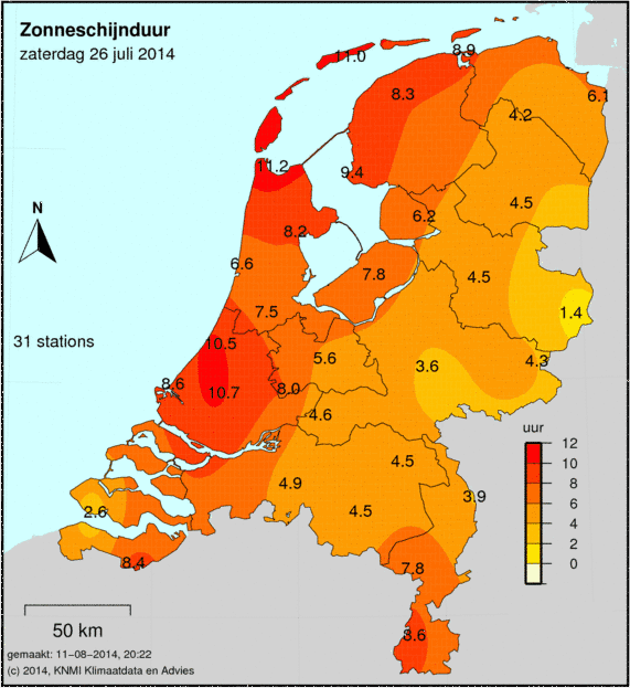 Het aantal zonuren wordt op 33 weerstations gemeten. Hoe donkerder de kleur, hoe meer zonuren er zijn gemeten. Het gemeten aantal zonuren staat op de kaart afgebeeld.