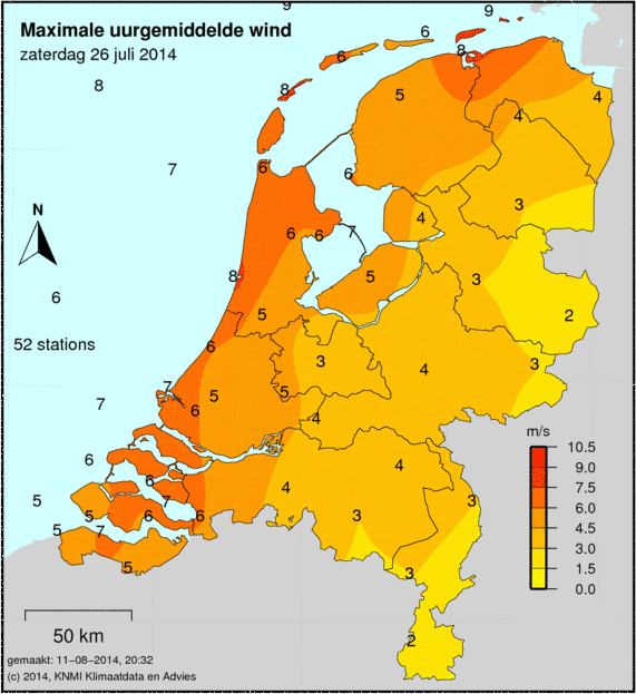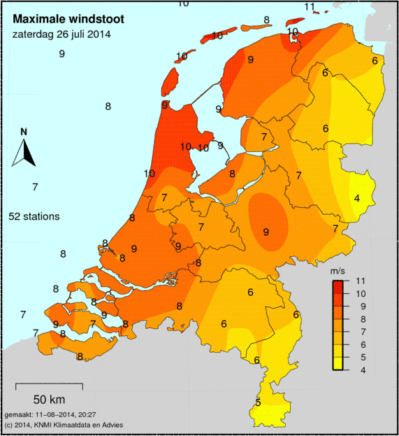 Bij windkaarten staat het maximale uurgemiddelde afgebeeld welke deze dag is gemeten. De windkracht wordt op 49 verschillende stations gemeten. Ook wordt de maximale windstoot weergegeven welke is gemeten.