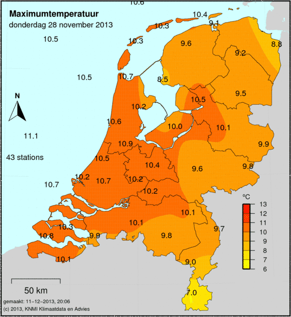 Bekijk het Weer 28 november 2013. Hoeveel neerslag was het die dag? Wat was de maximum, minimum en gemiddelde temperatuur die dag? Hoe lang scheen de zon en wat was de windkracht? Als er die dag een sneeuwdek lag, dan zie je dit op de laatste afbeelding.