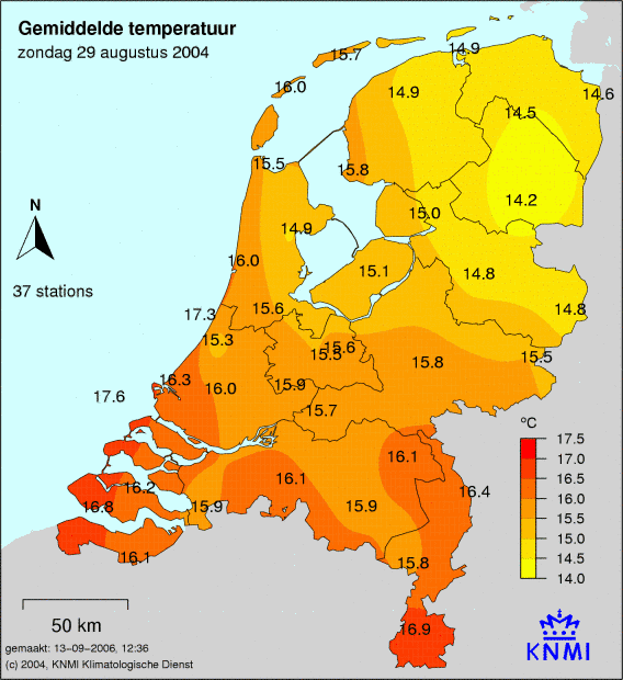 Bij de temperatuur worden drie weerkaarten getoond met de maximum temperatuur, de minimum temperatuur en de gemiddelde temperatuur. Hoe donkerder, hoe warmer. Het aantal graden staat afgebeeld. De temperatuur wordt op 37 weerstations gemeten.