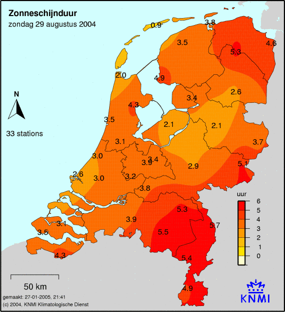 Het aantal zonuren wordt op 33 weerstations gemeten. Hoe donkerder de kleur, hoe meer zonuren er zijn gemeten. Het gemeten aantal zonuren staat op de kaart afgebeeld.