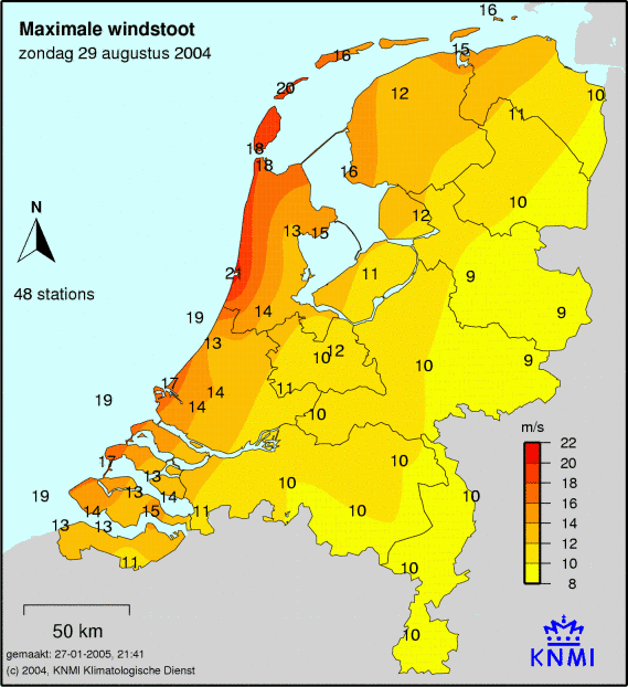 Bij windkaarten staat het maximale uurgemiddelde afgebeeld welke deze dag is gemeten. De windkracht wordt op 49 verschillende stations gemeten. Ook wordt de maximale windstoot weergegeven welke is gemeten.